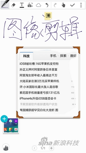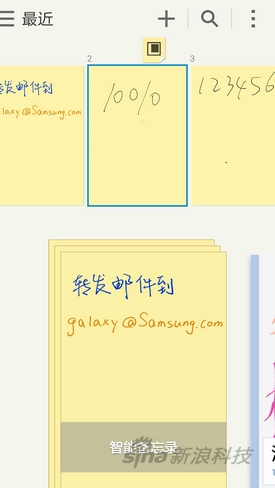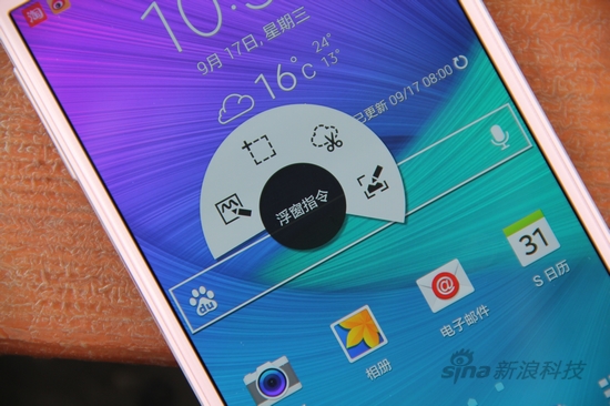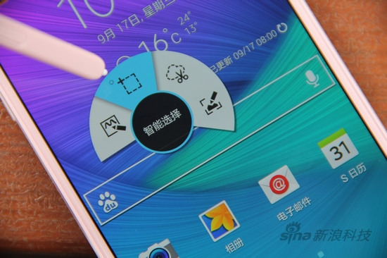S Pen是Note系列的灵魂,双击手写笔,主界面会出现圆形浮窗指令,其中智能备忘录除了记录一些东西之外,还可以智能识别用户行为,继续发邮件、搜索。智能选择则是在任意界面截图,截完还可以将其发送邮件或是分享至微博。
