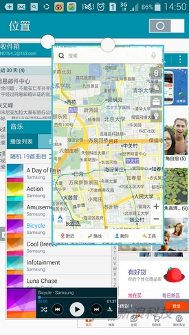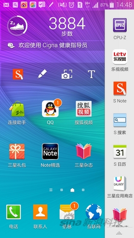 与Note 3的多任务界面类似,Note 4长按返回键即可唤出侧边栏,你可以将应用拖到指定位置,也可以随意浮在屏幕中央,并且它们都可以缩为一个小圆球,浮在屏幕上方。