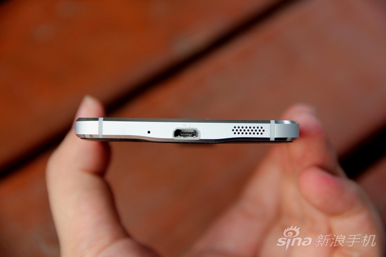 尽管GALAXY Alpha没有采用USB 3.0接口,它的底部接口处比两头略有突起,中框设计也因此有了一定的流线型。这款手机在细节上的处理还是比较到位的,像是正面屏幕玻璃下的方形纹理、背部的点阵纹理都让人想起S5。另外,摄像头左侧的区域证明了这款手机支持心率检测。