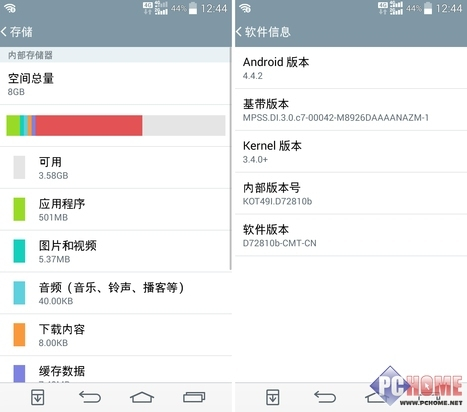 LG G3 Beat的容量相比G3有了明显缩水,标配容量仅有8GB,确实有些不太厚道,不过支持最大32GB的扩展存储,也算是可以弥补回来一些。系统版本为安卓4.4.2。