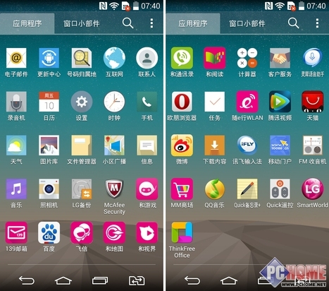 锁屏界面风格依旧,底部五个常用快捷按钮。滑动后进入桌面,LG智能手机的系统风格主要就是简约扁平化,没有什么太大的亮点,不过功能方面还是非常齐全的。