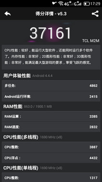 至于TCL么么哒3N的整体性能,我们还是通过常用的性能测试软件进行一番测试。在安兔兔评测(v5.3)基准跑分测试中,么么哒3N的总分为37161分,其中“3D绘图”性能得分高达8314分,而“多任务”性能得到为4862,从中不难看出该机的优势。