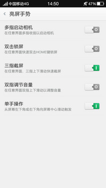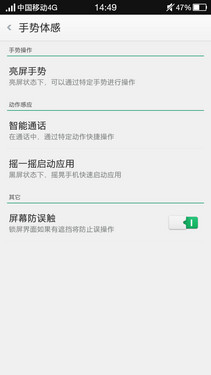 而在设置界面里,OPPO R1C针对5英寸屏幕内置手势体感功能,此功能包括:亮屏手势、智能通话以及摇一摇启动应用等选项,其中,亮屏手势可帮助用户更加便捷的操控,像多指启动相机、双击锁屏、单手操作等。