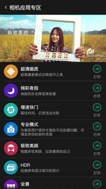 当用户轻按并向上滑动拍照键上方的<<<键时,即可看到OPPO R1C的相机插件模块,除一些可玩性很强的功能外,该机的专业模式除支持对焦、测光分离外,还可自行对白平衡、曝光值、感光度以及快门速度等参数进行设置,实用性媲美卡片数码相机。
