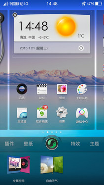 进入主界面后,可以看到该机没有二级菜单,所有操作都在桌面上完成,如果你觉得应用程序太多没地方放,把图标堆叠成一个文件夹即可节省空间,当然,要想设置个性桌面,只需轻按屏幕左下角的菜单键,便可对插件、壁纸、特效以及主题等进行设置。