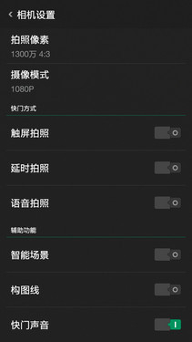 而在设置界面中,OPPO R1C加入了快门方式和辅助功能,其中,快门分为触屏、延时、语音三种快门方式,用户可根据自身需求来选择。而辅助功能则可对智能场景、构图线、快门声音、地理位置等常用功能进行设置。此外,用户还可更改拍照像素和摄像模式。