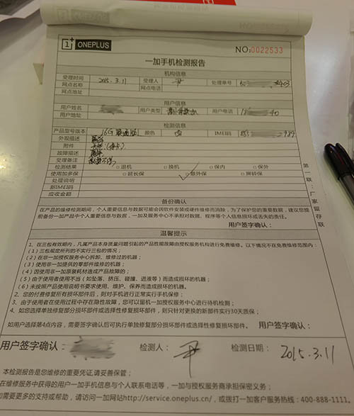 预约好的一加授权服务中心在朝阳区高斓大厦,经过一个多小时奔波终于到达了一加的授权服务中心,说明情况后 工作人员开始填表(一加手机检测报告)。随后工作人员又看了看购机发票等材料,之后工作人员来了一句缺东西呀!询问后得知还需要意外保截图复印件,工作人 员表示用服务中心的电脑登陆一下一加账号,截屏打印就可以了,原来是虚惊一场。