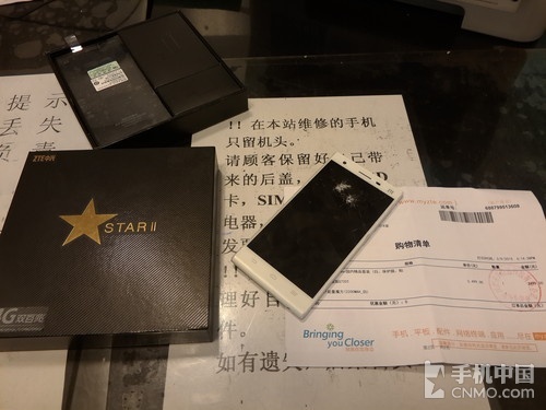 中兴星星2号外观损坏明显,屏幕直接碎裂,可以显示但不能能操作。这款中兴星星2号购买了188元的意外碎屏专项服务,中兴官方介绍是在一年保修期内,发生意外坠落、碰撞等导致手机触屏损坏(破裂),可提供一次完全免费维修。