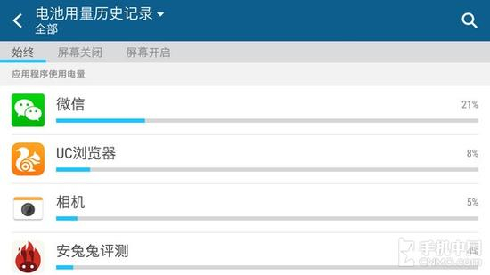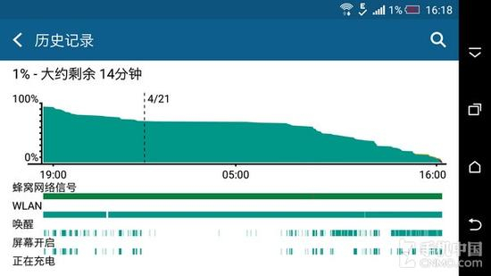 至于续航方面,HTC One M9内置了一块2840mAh电池(不可拆卸),与HTC One M9+相同,相比前作HTC One M8(注:2600mAh电池)略大一些。经过笔者(注:轻度手机用户)正常使用,在充满电的情况下,历经大约21个小时之后,手机的电量降至1%,如下图所示,续航表现一般。对于重度手机用户来说,有必要配备一块大容量移动电源。当然,结合该机自带的“节电模式”,也能够一定程度上延长手机续航。