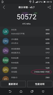 尽管就目前来说,手机的硬件配置已经过剩,不过我们还是通过具体的测试数据看看该机的整体性能。在安兔兔评测(v5.7)基准跑分测试中,HTC One M9的总分在5万左右,如上图所示,在热门机型跑分排行榜中居于首位。值得一提的是,就单项来说,它的“3D绘图”性能得分逼近2万分,高达17838分。由此可见,Qualcomm骁龙810八核处理器强劲的3D性能。