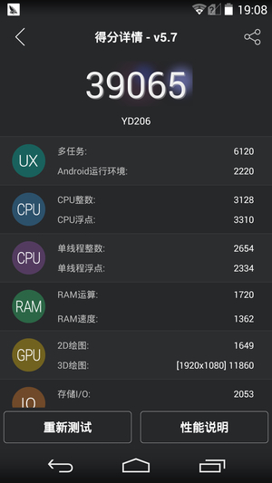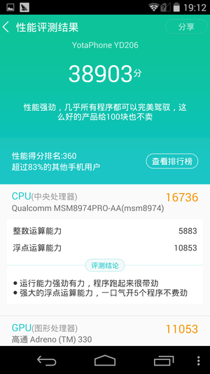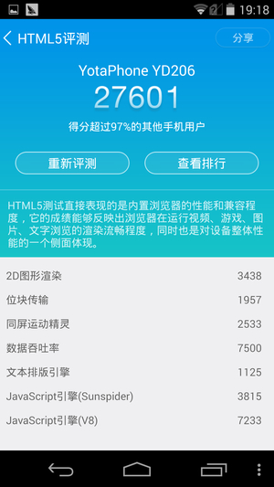 YotaPhone 2搭载了骁龙800的四核处理器,2GB运行内存。这个配置在现在看来并不算十分抢眼了,因为骁龙800已经是2013年左右的配置了,尽管如此,但YotaPhone 2在实际跑分中成绩还是比较不错的,属于现时中端机的水平,配合原生Android系统,无论是日常操作还是运行大型游戏都比较轻松。