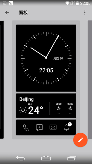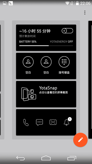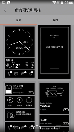 在YotaPanel模式中,用户可以用来看手机的状态,并且根据需要设置墨水屏显示的续航时间、联系人、短信、显示拨号键盘等,并且软件中内置了很多模版空给用户选择,用户可以用YotaHub设置里面的YotaPanel的布局。