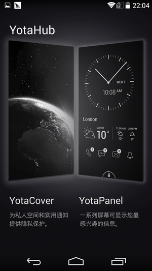 打开YotaHub,里面分别有YotaCover和YotaPanel两个东西。简单来说YotaCover是背面屏幕的待机画面设置,而YotaPanel就是背面屏幕的功能面板,这两个功能区域均可以由用户进行自定义设置。