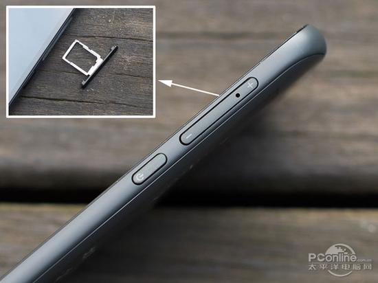 YotaPhone 2的接口和按键都放置在了手机右侧,而且还有一个比较人性化的设计就是将音量键和SIM卡插槽巧妙地设计在了一块,可以有效地节省机身的空间。因此可以看到音量键里面是有一个小孔,用卡针就可以打开SIM卡槽来更换SIM卡。