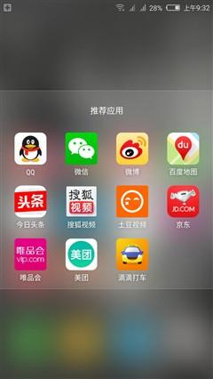 在锁屏界面下,用户除了可以快速解锁之外,还可以快速唤醒拨号键盘以及相机。进入主菜单之后我们看到,UI采用扁平化设计,图标简洁。app文件夹也十分简单清爽,背景经过模糊处理。