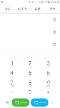 拨号界面也可快速选取卡1或者卡2进行拨号,在拨号过程中一般常用的公众号码会有提示。