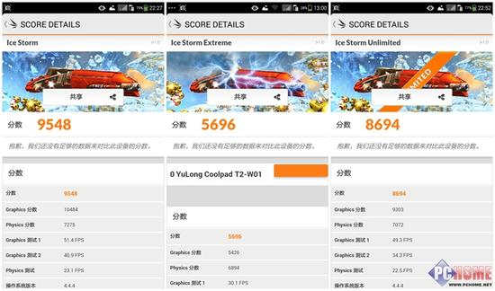 图形性能方面我们使用3D mark来进行一个测试。3DMark是一个跨平台的软件,在Android系统使用OpenGL ES 2.0,测试成绩可参考性很高。我们分别进行了Ice Storm,Ice Storm Extreme,Ice Storm Unlimited三种模式的测试。其中Ice Storm的测试结果9548,Ice Storm Extreme得分5696,Ice Storm Unlimited得分8694,这个成绩也是我们预料之中的,与机器定位相当。