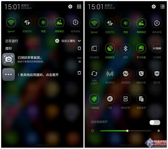 下拉菜单采用了毛玻璃效果处理,长按图标可进入详细设置或者拖动就行位置排序。默认下拉为左图视图,只显示底部五个开关和通知,点击右上角九宫格图标可进入全部快捷开关界面。