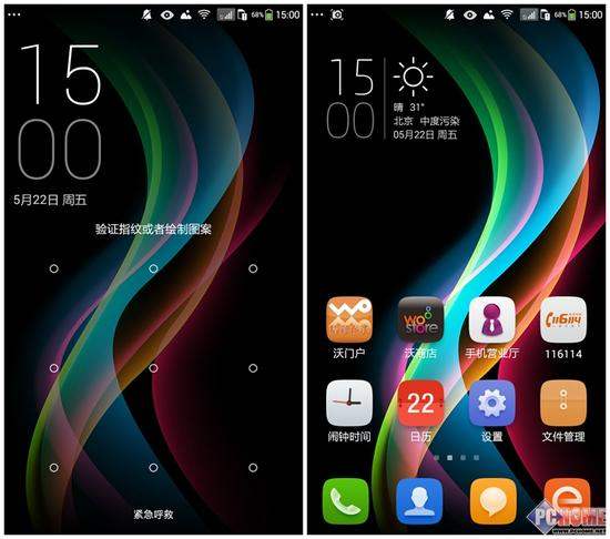在设有密码的情况下,可以通过指纹快速进行解锁,也可绘制图案或者输入密码解锁。进入桌面以后,会发现整体风格还是比较小清新,图标以圆角矩形为基本轮廓,风格简约。