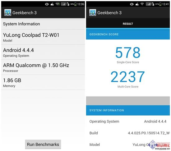 在Geekbench 3的测试中,这款处理器获得了单核578,多核2237的成绩,与骁龙801相比差距还是比较明显的。