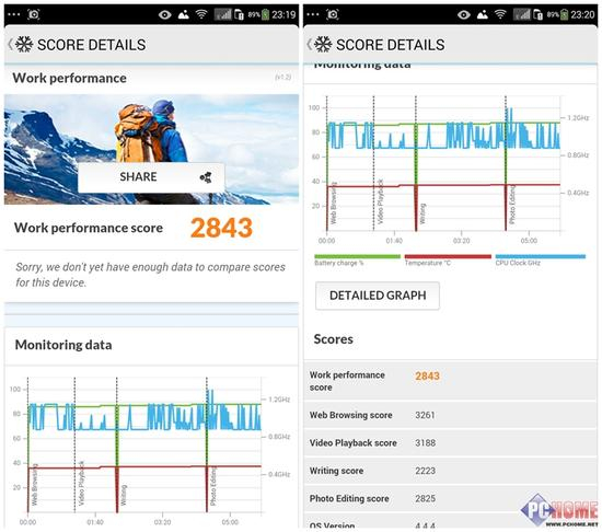 PCMark for Android支持手机和平板,包含Work performancek、Work Battery两个测试项目,可考察设备的性能、电池续航能力,能看出设备在日常使用中的表现。通过测试,锋尚Pro在效能表现方面的成绩为2843分。