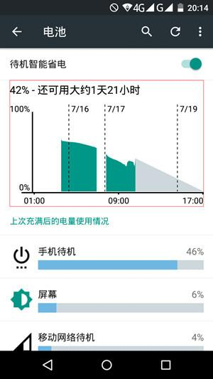 手机待机40分钟才消耗了百分之1的电量,日常轻度使用可以使用两天左右,而待机到了第三天还有剩余电量,看来性能不高是应为牺牲了部分性能去控制电耗。这样也可以解决随身带移动电源的尴尬,也许正式版经过优化后会有更好的表现。