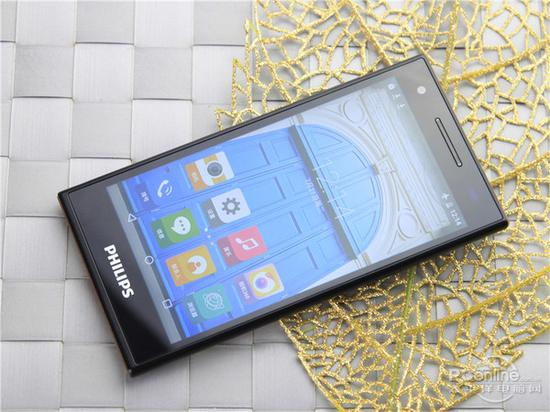 手机顶部设有800万像素的摄像头,中间是长条状的听筒,而光线感应器和距离感应器则位于听筒右侧,分布的比较分散,但没有影响机子整体的视觉上的一体 性。而机子正下方没有使用常见的触摸式按键,而是改为了十分科技感的虚拟按键,正下方取而代之的只有一个大大的飞利浦标志。