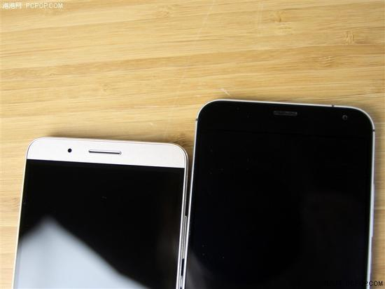 因为采用了旋转镜头的设计,因此荣耀7i的屏幕上方并未设置前置摄像头,仅有光线、距离传感器和听筒,听筒四周有一圈包边,视觉上感觉非常精致,同时也有较好的防尘效果。魅族MX5的屏幕上方有光线距离传感器、听筒和前置相机,但是传感器设计十分隐蔽,很好的隐藏在了黑色面板里。
