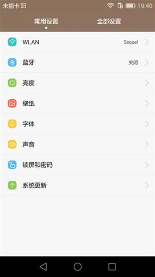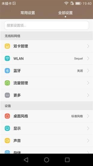 设置栏EMUI分为常用设置和全部设置两项,一般的操作在常用设置中均可以完成,全部设置栏分为了无线与网络、设备、隐私与安全、账户、应用、智能辅助和系统几项,功能非常完善。