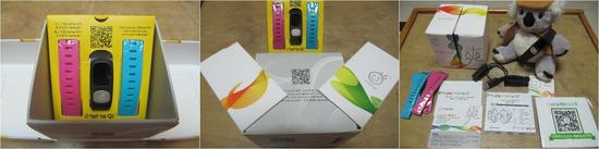 盒内包含一只HeHa Qi智能手环,自带黑色手带,并附送天蓝色和桃红色两只手带,男生、女生都适合佩戴了;并且还有一个运动夹,可以将HeHa Qi夹在皮带等地方。智能手环肯定少不了与手机相连,二维码提供了公众号以及HeHa App的下载方式。