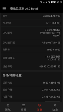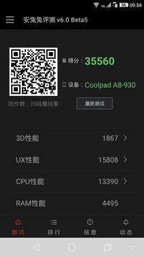 面向中高端市场的酷派锋尚MAX显然对于设计和体验的重视程度高于硬件,它采用的只是面向中端市场的64位高通MSM8939八核处理器,内存配置为16GB ROM+3GB RAM,这个配置在安兔兔V6测试中的得分为35560。整体来说,锋尚MAX的性能对于日常使用来说是绰绰有余,只是在玩小部分大型3D游戏时的表现弱一些。