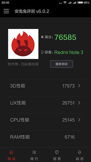 在安兔兔评测(v6.0.2)基准跑分测试中,红米Note 3全网通版的总分突破了7万关口,达到了76585分(注:在手机的“效果模式”下测试),逼近8万大关,其中“UX性能”和“CPU性能”双双突破了 25000分,跑分成绩表现抢眼,相比红米Note 3双网通版更具优势,体现出了高通骁龙650处理器的优势。