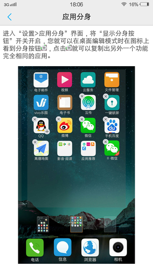 应用分身是个比较实用的功能,适合拥有多个社交账号的用户(目前仅支持 QQ、微信和淘宝)。在桌面编辑模式下,单击有“ + ”标志的图标就能生成一个应用分身,该分身与主应用相互独立,数据不互通,相当于在另一台手机上使用相同的应用。需要注意的是,删除主应用的同时会删除复 制出来的应用分身,而且会增加本地的数据和流量使用。