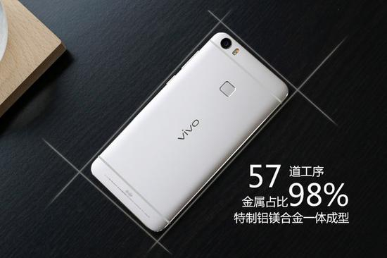Xplay5金属后盖是主要由整块铝镁合金材料经过切割加工成形,官方宣称其由历经铣削塑形、PMH纳米注塑、手工抛光、镭射雕刻、蜂巢阳极氧化等57道工序打造而成。