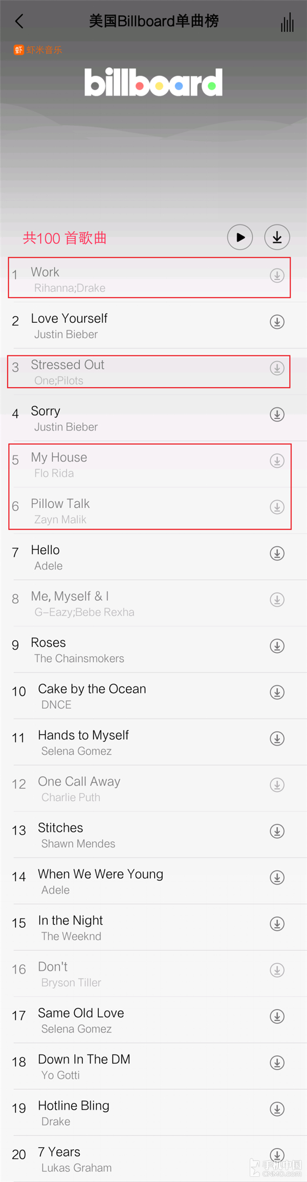 部分歌曲因为版权问题,有些已经下架了,有些则是没有上架(如下图所示红色框部分),总的来说,一份榜单下来,能够听到的歌曲还是比较多的。