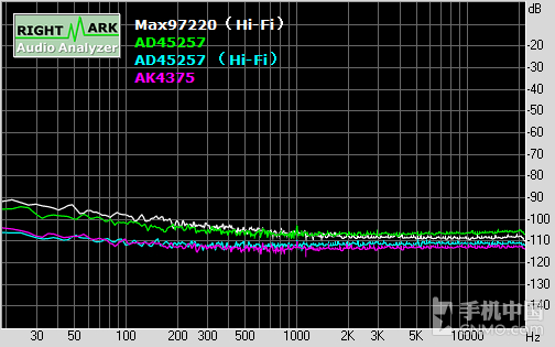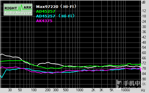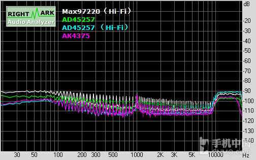 再一次证明vivo对CS4398这套Hi-Fi方案的调校重点落在了中频部分,低频和高频部分的线条都比较平稳,但是中频部分波动比较大,这一点除了 能够从vivo Xplay5曲线体现到,还能够从另一套同样采用了CS4398 DAC的Hi-Fi方案中看到(白色曲线部分)。