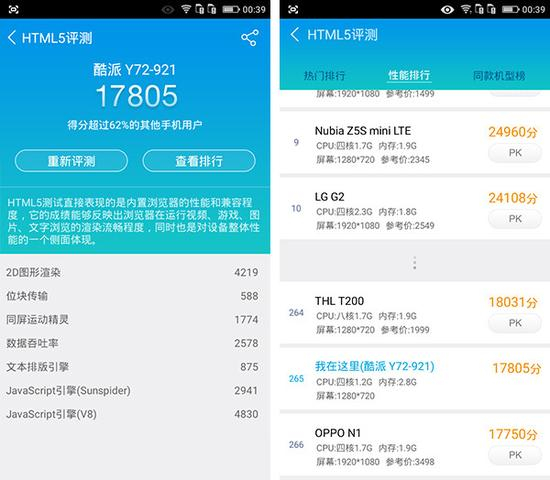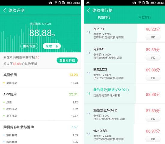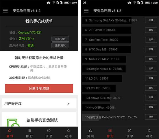 正如我们所料,高通骁龙MSM8916处理器在经典的测试平台安兔兔和鲁大师上得分均不高,26000+的实际评分也和主流的千元机型得分有一定的差 距。但就实际体验而言,锋尚mini的表现并不差,尤其是基于安卓5.1的Cool UI经过了大量的优化和精简,在操作和运行方面都有不错的体验。