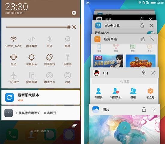 也许是要和锋尚mini时尚的外观相配搭,Cool UI 8.0的主界面运用了大量色彩丰富的元素,带来了耳目一新的小清新格调。系统的通知栏和多任务界面相较于原生系统来说并没有太大的改变,支持全局下拉和一键清除也足够方便。