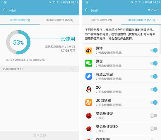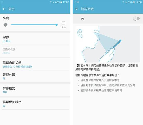 由于脱离了谷歌的限制,国内的应用生态里各种应用程序都拥有极强的“表演欲”,相互间对系统资源的无休止占用成为了卡顿等问题的主要来源。 Android 6.0的Doze Mode就是解决这一问题的杀手级应用,而在TouchWiz里它被归入到了智能管理器的自启动控制中,按照谷歌的说法:设备将可感知到自己何时处于空闲 状态并禁用部分后台进程和其他耗电功能,在不影响通知功能的前提下大幅延长续航。