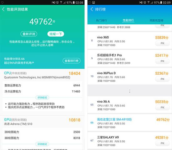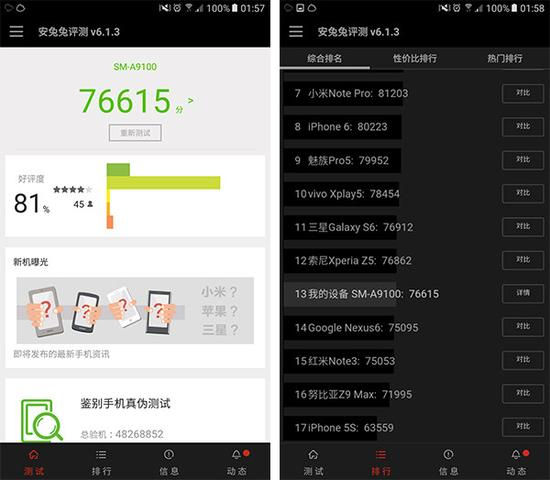 在鲁大师和安兔兔这两款经典跑分软件中,三星A9 Pro展现出了不错的性能,总体分数已经接近大部分搭载高通骁龙810芯片的机型。并且更令人惊喜的是,笔者体验期间,无论是大型游戏还是跑分全速运 行,A9 Pro都不会出现过热现象,最严重也只是金属边框有些热,但还远远称不上烫手。