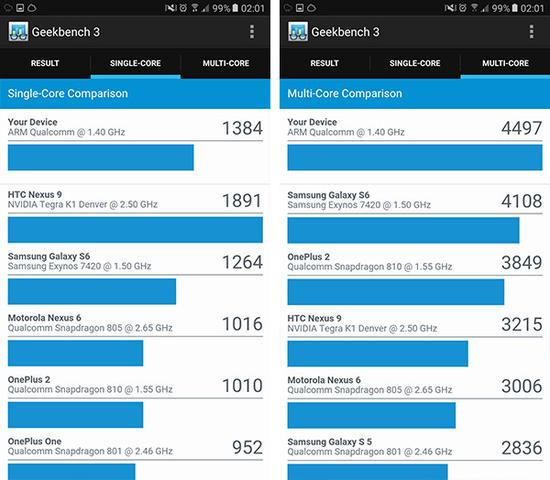 而在Geekbench 3这款著名处理器性能测试软件中,骁龙652同样表现出了不错的性能,其中A72核心单元的单核性能和上一代骁龙810的单元核心性能还有较大幅度的提 升,也因此在多核性能测试中得以继续压制后者。当然,作为高通严密产品线规划路线中的一员,骁龙652在显示性能上距离骁龙810/820还有较大距离, 这点在像NBA 2K15等大型游戏中不太流畅的体验便能感受到。