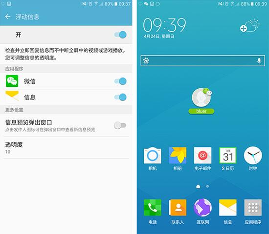 随着智能手机的屏幕越来越大,如何有效利用加强操作效率成为了各大系统重点发展的新领域,和国内第三方系统选择分屏不同,TouchWiz给出的答案是 “浮动信息”。当用户处于观看视频或玩游戏状态下,指定的信息源(如微信)收到信息,系统就会自动触发一个顶部小通知,方便进行预览或直接回复操作,相当 好用。