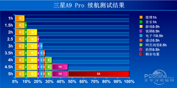 从实际5小时测试成绩来看,三星A9 Pro的成绩十分优秀,在一天的中度使用后依旧能剩下54%的电量,这样出门在外需要应付两天乃至三天的使用时完全可以摆脱沉重的移动电源,而付出的仅仅是手机稍重一些的代价,对于重度手机用户来说这样的妥协无疑是值得的。