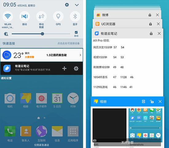在日常接触最多的主界面上,TouchWiz依旧保持了以往较为动感的风格,经典的应用抽屉也可以选择保存,方便习惯了旧版UI的用户快速适应新系统风 格。而通知栏也是如此,快捷开关和信息通知上下分隔,前者通过滑动进行选择,后者上下拉可呼出更多通知。变化较大的反而是多任务界面,尽管卡片式的设计还 在,不过三星添加了国人常用的一键关闭和锁定功能,比以往要好用很多。