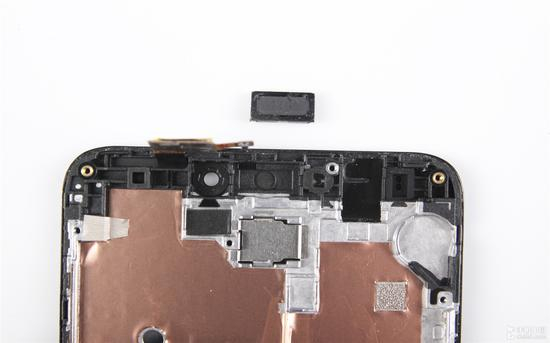 分离机身,360手机N4在后盖内有大块的石墨散热 贴纸和泡棉贴,底部扬声器位置有红色的滤网,这就是360手机N4扬声器是动感红色的原因。