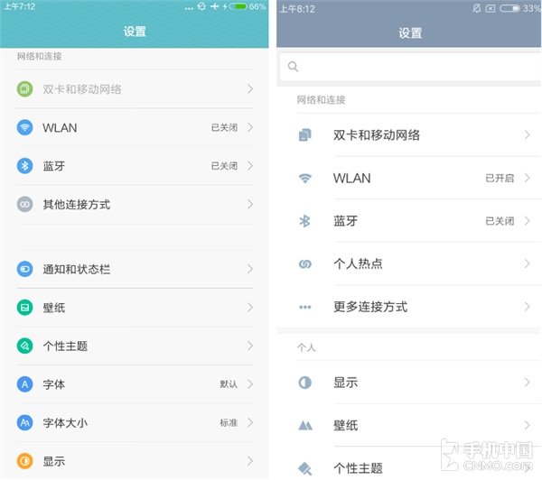 MIUI 8的系统设置菜单除了加入了搜索栏还把色调变成了统一风格,不再用颜色区分不同设置选项。