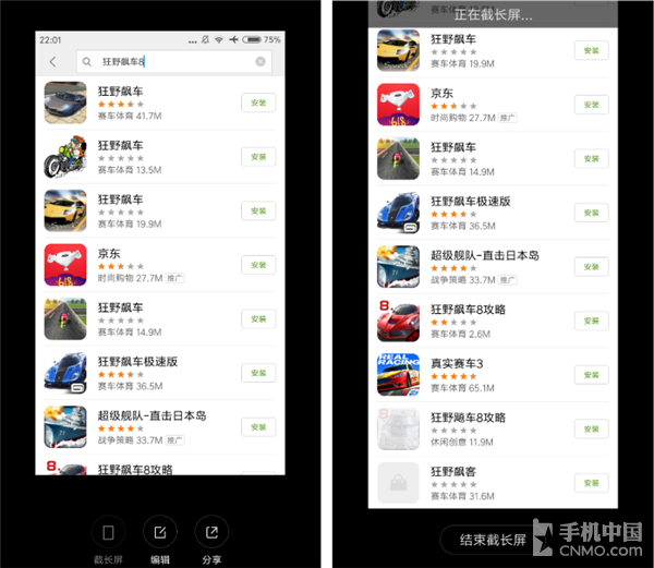 这也是今年很多厂商开始陆续引入的功能,早在上年我们已经看到部分定制化Android系统已经抢先实现了这项功能。先吐槽MIUI 8在普通截屏之后会将截屏后照片缩放在屏幕右上角一段时间,之后才会自动消失,而且这个功能是无法像MIUI 7时候那样通过禁用通知栏截屏提示来强制关闭的。