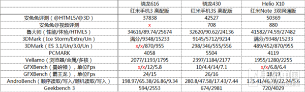 首先我们看到搭载骁龙616的红米手机3 高配版出现了比较多软件兼容性问题,很多跑分软件都无法正常运行。搭载Helio X10红米Note 3双网通版也遇到了类似的问题,相反最新铺货的骁龙430则全部通过跑分软件的兼容性考验。