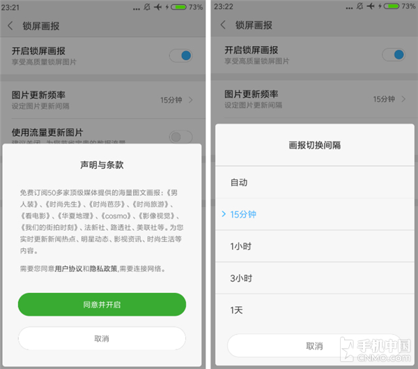 其实MIUI 7开始就已经有这个功能,而官方称MIUI 8上壁纸将会更加精致和独特,让你每次点亮屏幕时候都有眼前一亮感觉。如上图所示,壁纸资源主要来自《男人装》、《时尚先生》和《华夏地理》等图文画报, 审美眼光人人不同,我们只讨论功能的易用性。在锁屏界面点击右上角的四叶草图案即可进入设置界面,可以选择关闭这个功能也可以选择间隔多长时间更换一次壁 纸。