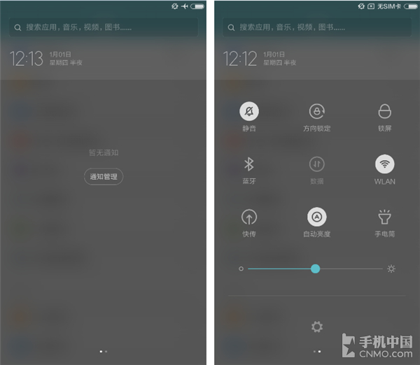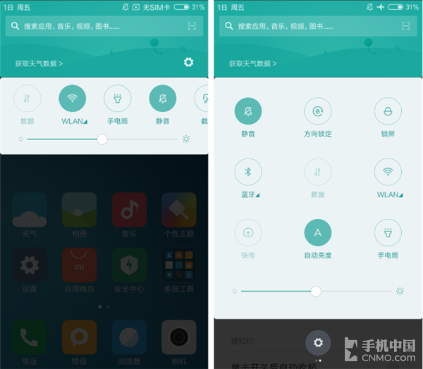 在MIUI 7基础上MIUI 8提供了另一种通知栏布局给消费者选择,用户可以在系统设置菜单中选择单页显示还是双页显示通知栏,回归到MIUI 5时候的设计。